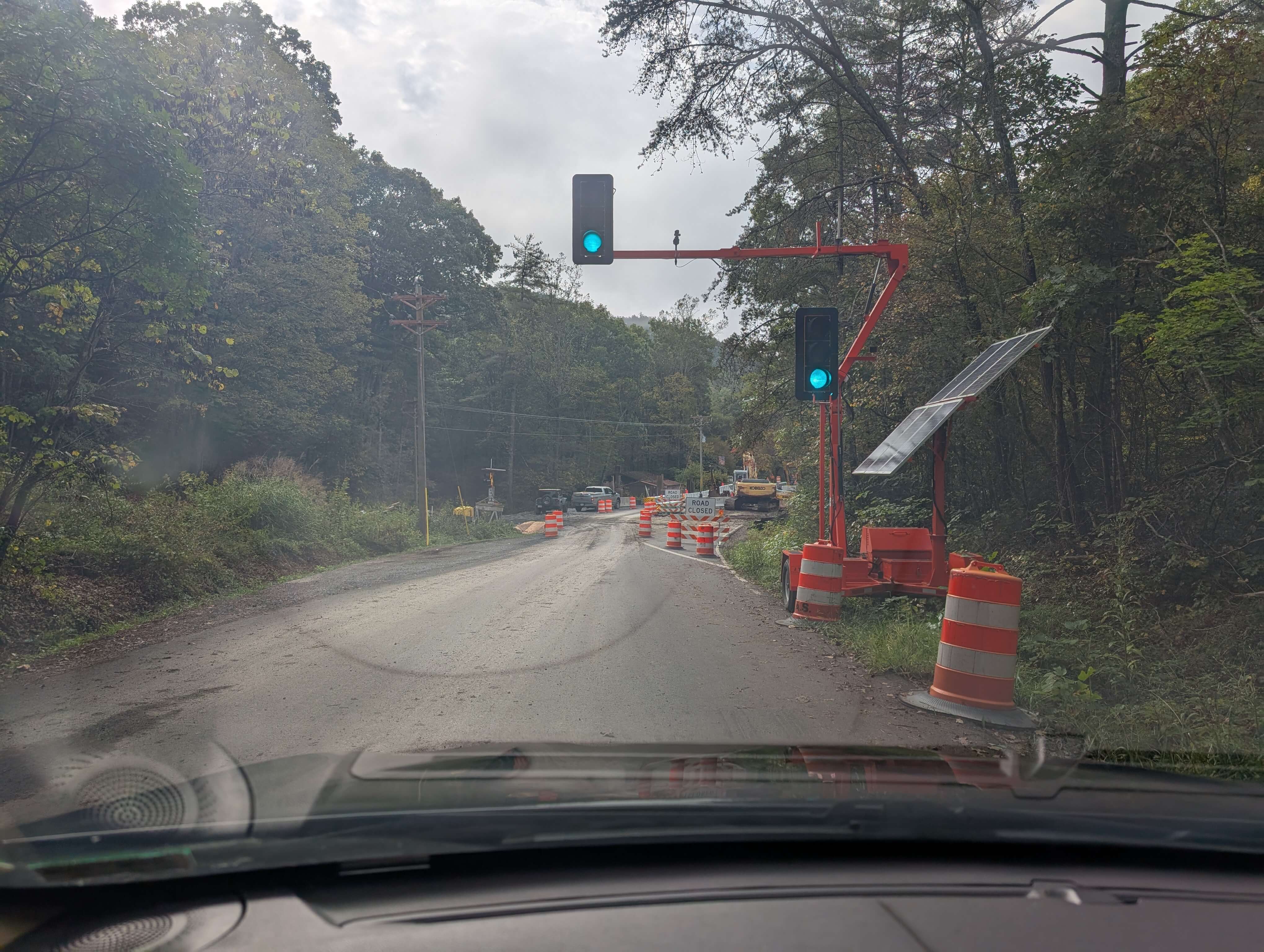 There was no crew member with a flag guiding traffic, but a temporary stoplight to guide traffic through this little stretch of one lane road. Of course as I sat at the red light attempting to get a photo - the light turned green. I'd never seen this before, but with sensors above the temporary light it seemed like a way more efficient mechanism than two people with radios.