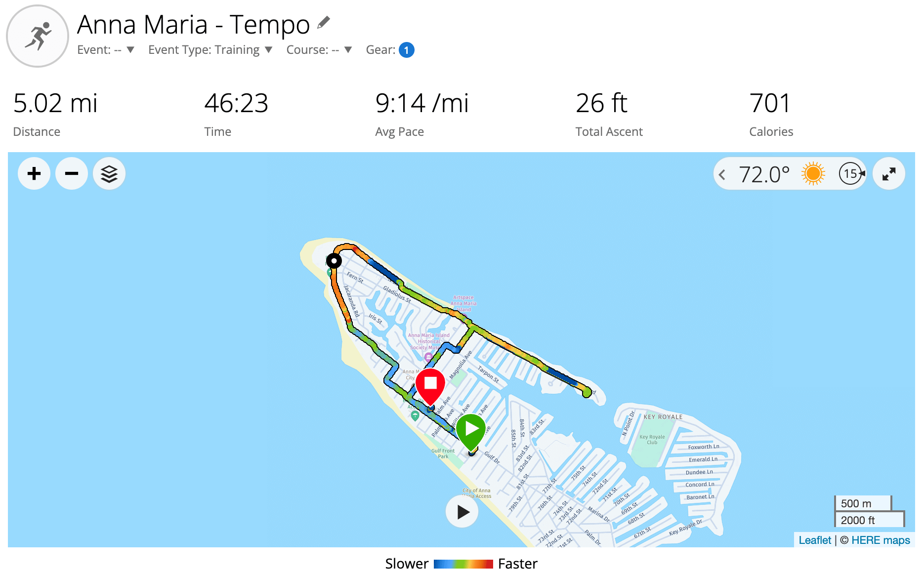 As the next morning dawned it was time to head out for a morning workout before the day got started. I was prescribed, via my watch, a tempo workout which means I basically run faster for a bit followed by a shorter break of slower pace. I enjoyed doing a large loop and checking on the other side of the island while training for an 8k. I basically just do the workout the watch says and follow its recommendation each time.