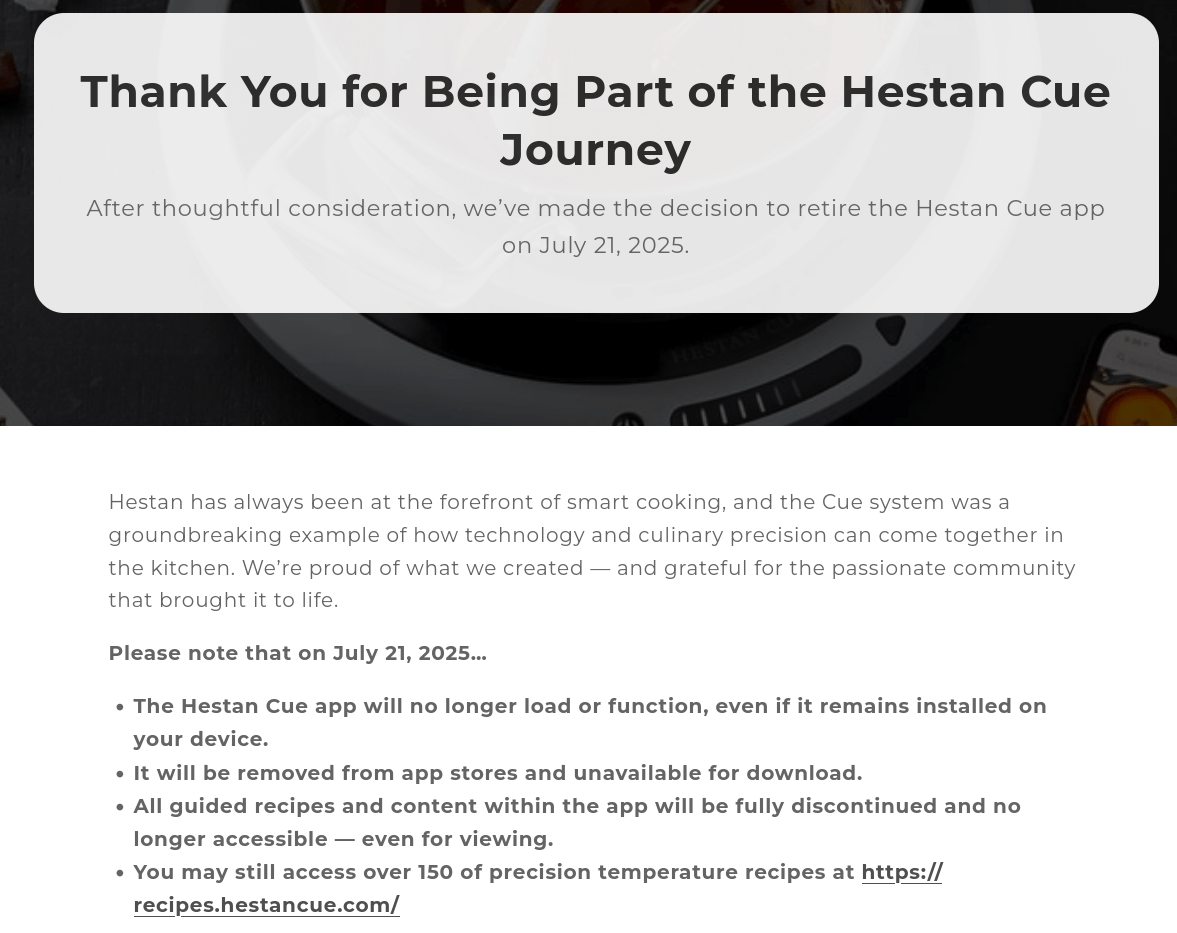 After July 21, 2025, if you own the Hestan Cue cooktop and cookware, you will no longer be able to use them with any "smart" functions or for any "guided" recipes. This is because all smart cooking functions and guided recipes are hosted by the Hestan Cue app.