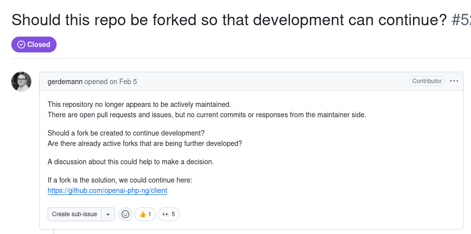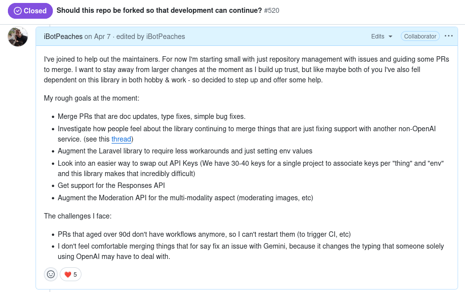 So throughout work we've done our fair share of donations and forking, but I wanted to try something different as I encountered delays in OpenAI for PHP and fastlane merging fixes we required. I wanted these projects to succeed, but if donations didn't help and contributed code didn't help - it was time to try something else. The OpenAI for PHP SDK was missing the massive new OpenAI endpoint (Response API) and fastlane was generally just decaying hard when it came to new iOS changes and Xcode 26. Even the community in both of these situations were wondering the same as myself.