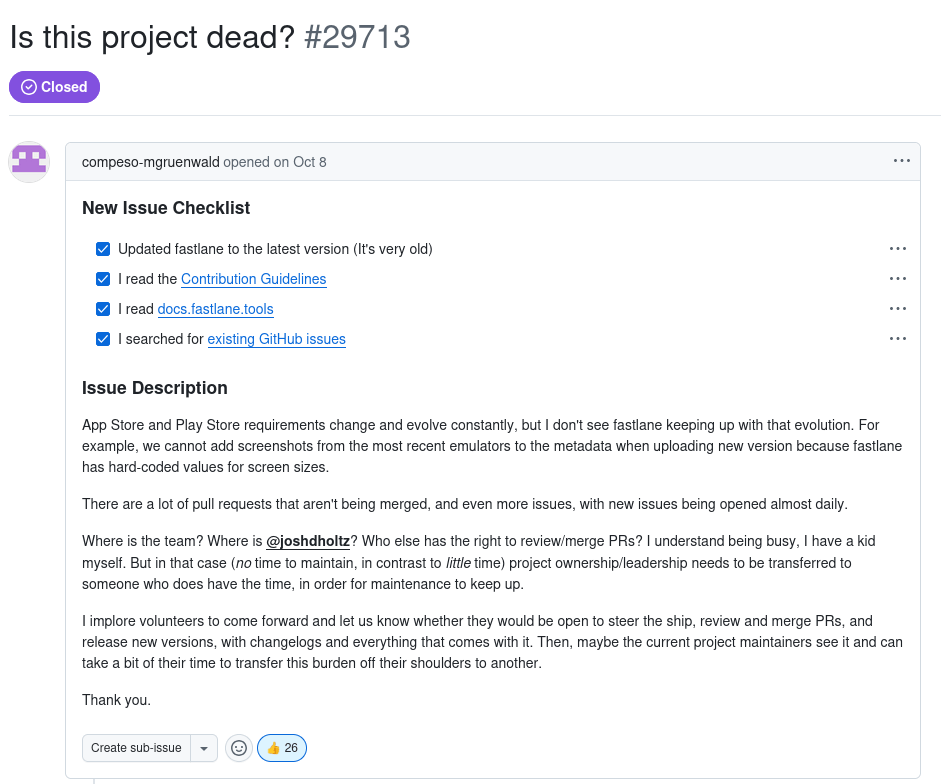 In February of 2023 hope had started with a thread spawning on Mobile Native Foundation urging Google to give up fastlane and give it back to the community. In October of 2023 that was actually approved by both organizations. Though as the clock ticked into 2025 not much had changed. Google references were all over the codebase. CI systems had decayed and even with a staggering amount of maintainers the open issue count across all repos exceeded 1,500.