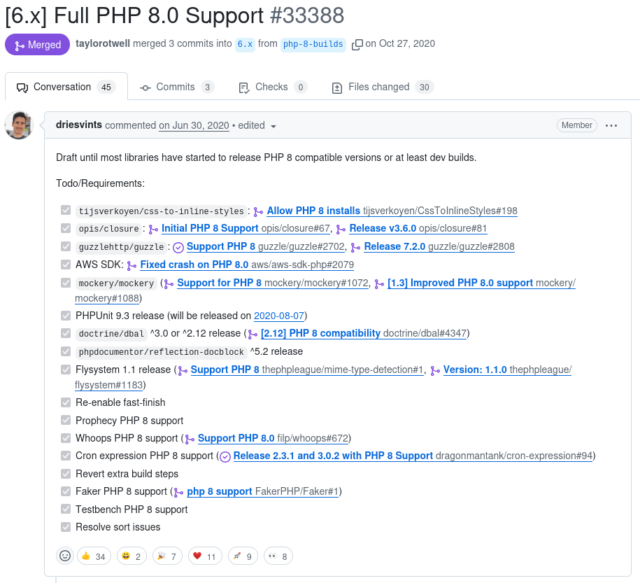 In some situations during this effort they may find a project is simply not reacting to their work and it stalls out - blocking their upgrade effort. This may result in monetary donations to entice a maintainer to support, asking to join the efforts with elevated permission or just forking and moving on. A perfect example of this was when fzaninotto/Faker went abandoned so Laravel helped start a generic organization FakerPHP with maintainers from different frameworks across the ecosystem of that forked package.