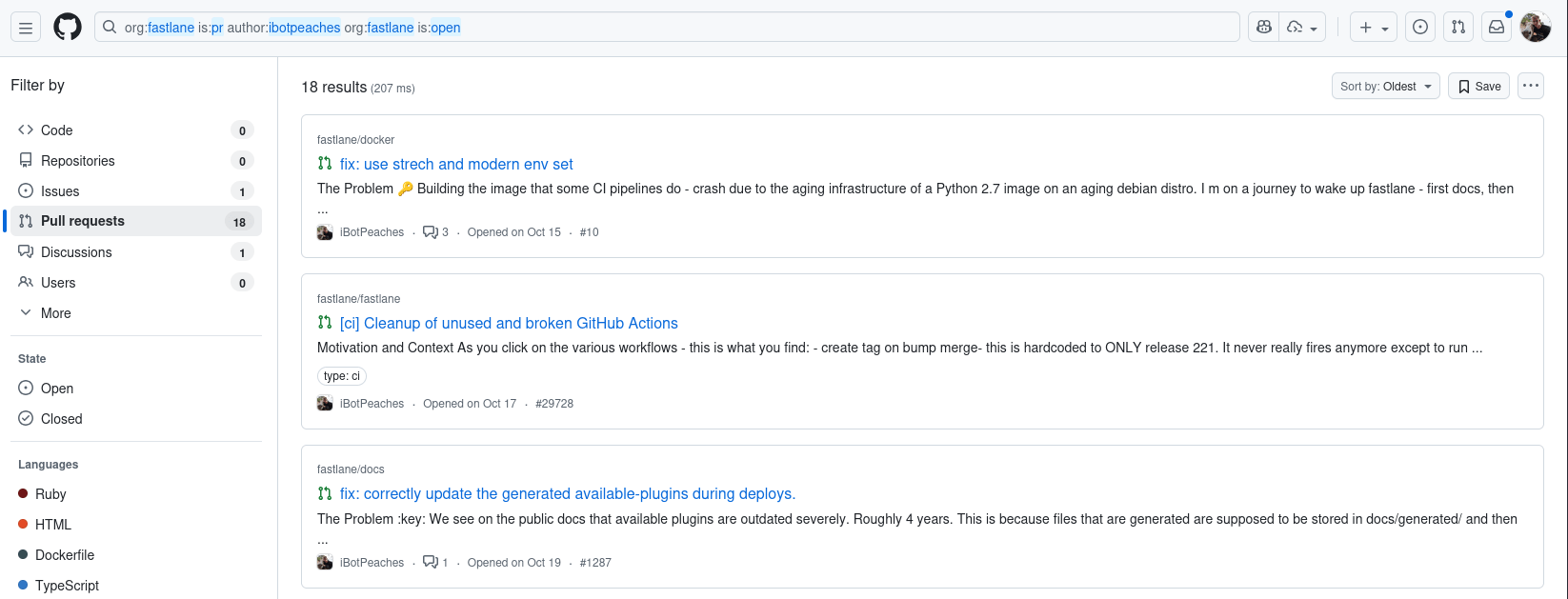 On the fastlane side - I'm stacking PRs across so many repos right now its getting difficult to follow. When another maintainer comes along to give an approval or feedback I'm moving again, but the speed of requiring another reviewer it'll take some time. Even if you get needed approvals some of the deployment mechanisms to RubyGems, Docker or Netlify are housed under a single individual. This means you gotta track down that one guy holding the key and ask for support to push a project forward.