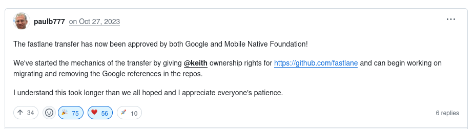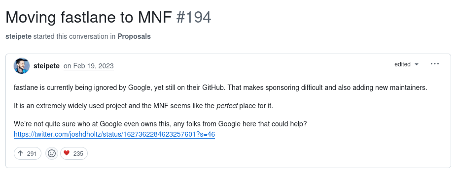 Sure enough in February of 2023 Josh explained that Google had abandoned sponsoring in the end of 2021. Once this hit Hacker News a few folks upset that Google was basically letting fastlane decay put up some suggestions. One of those was to ask Google to move the project into Mobile Native Foundation's hand.