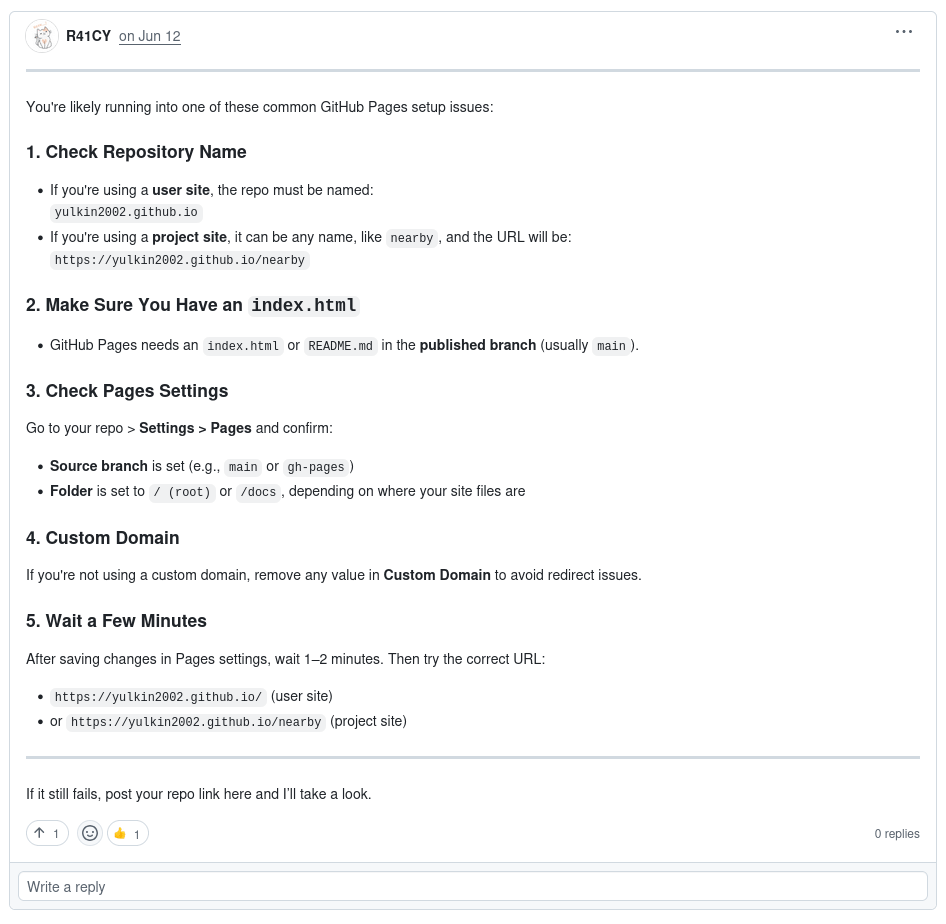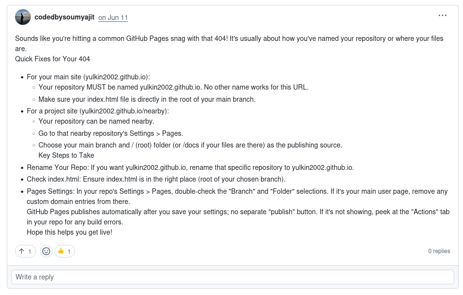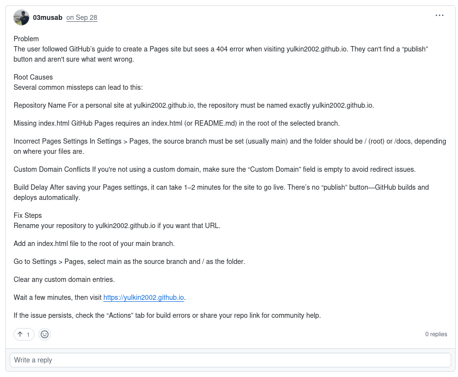 However, a different side of GitHub is full of messages that I pretty much classify as spam, but in this case is the ever increasing amount of purely LLM generated comments. I was doing some Googling on a basic 404 on GitHub Pages on a domain and stumbled upon a thread with my same error.