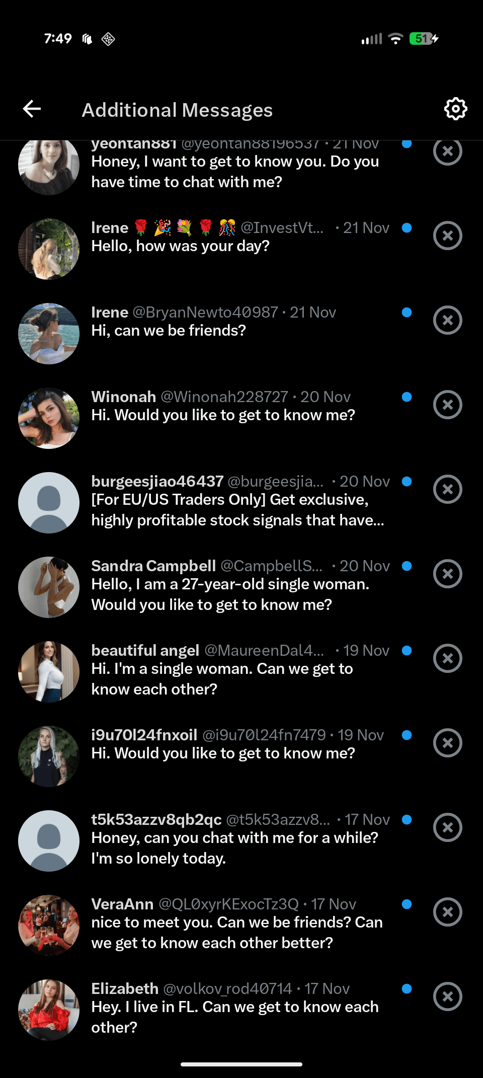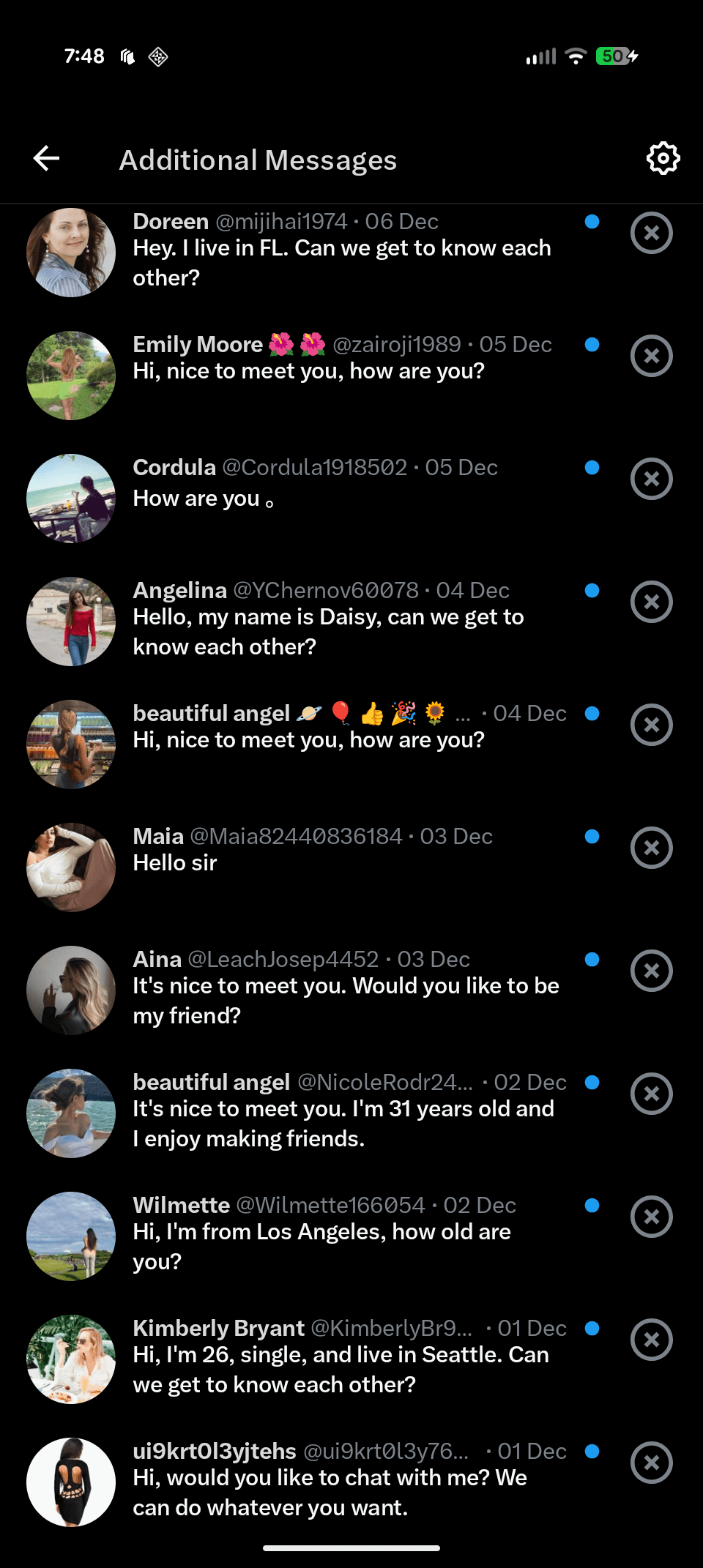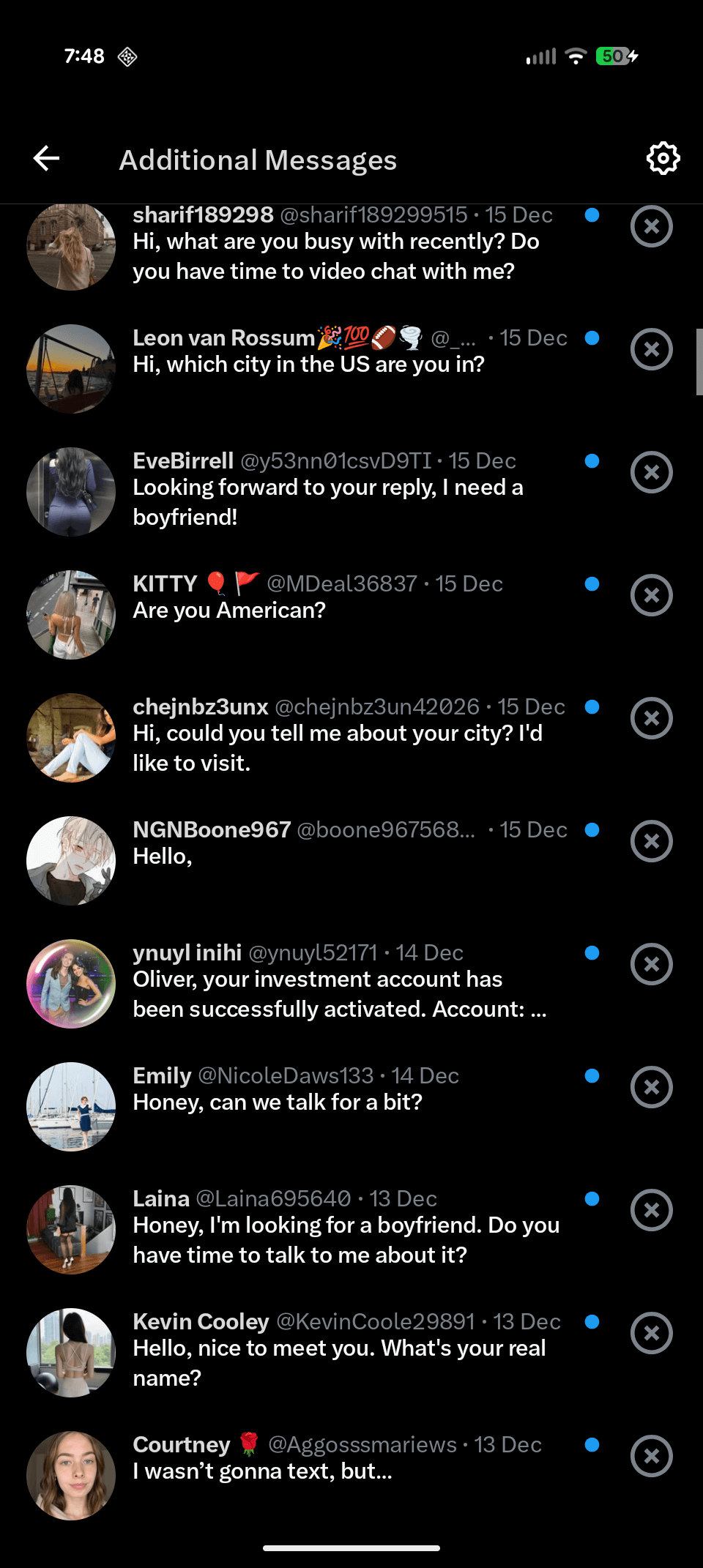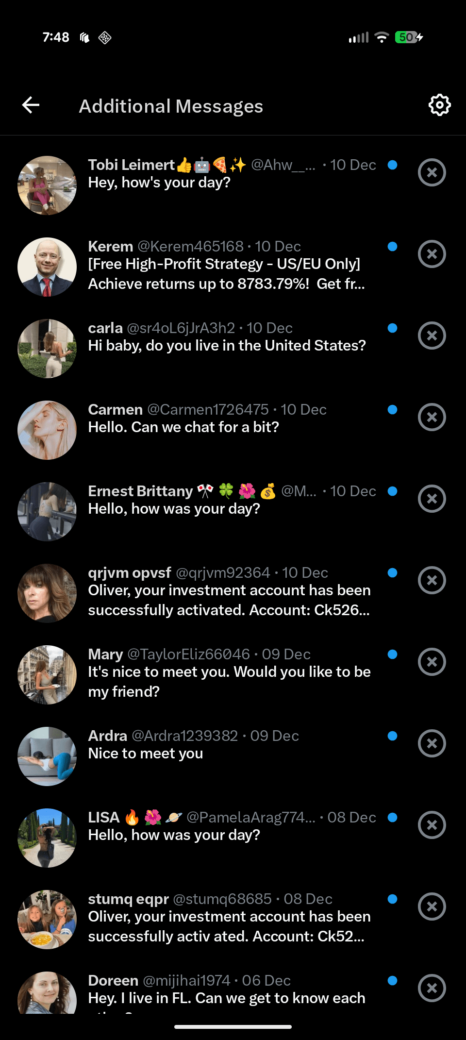 Twitter (X) direct message spam from November 17 -> December 26 (2025)