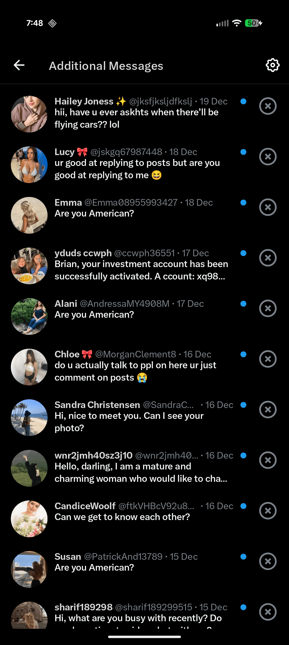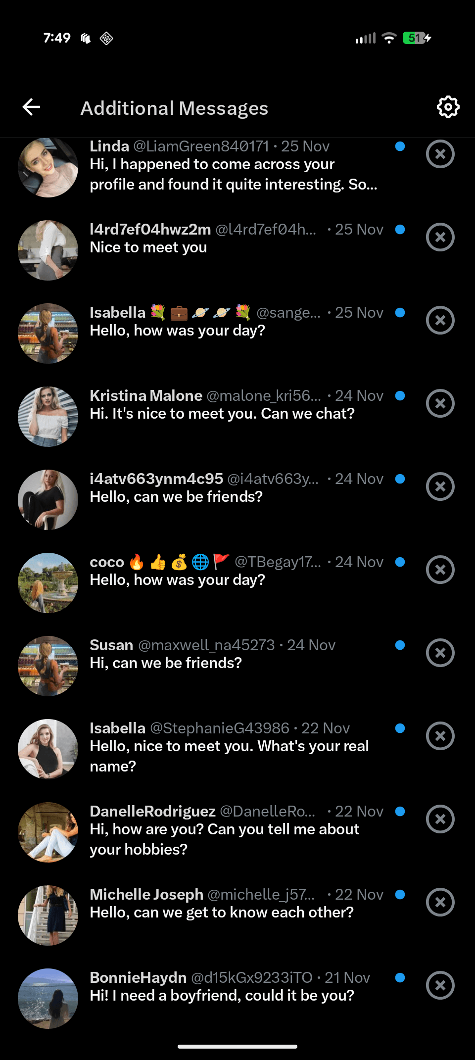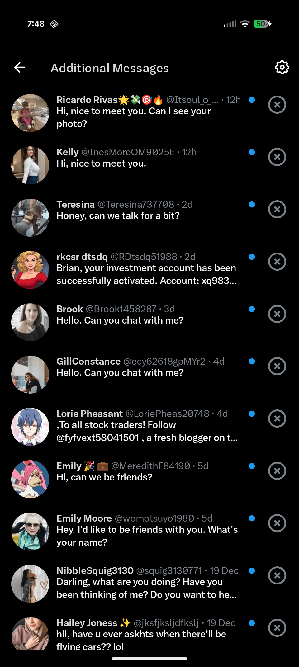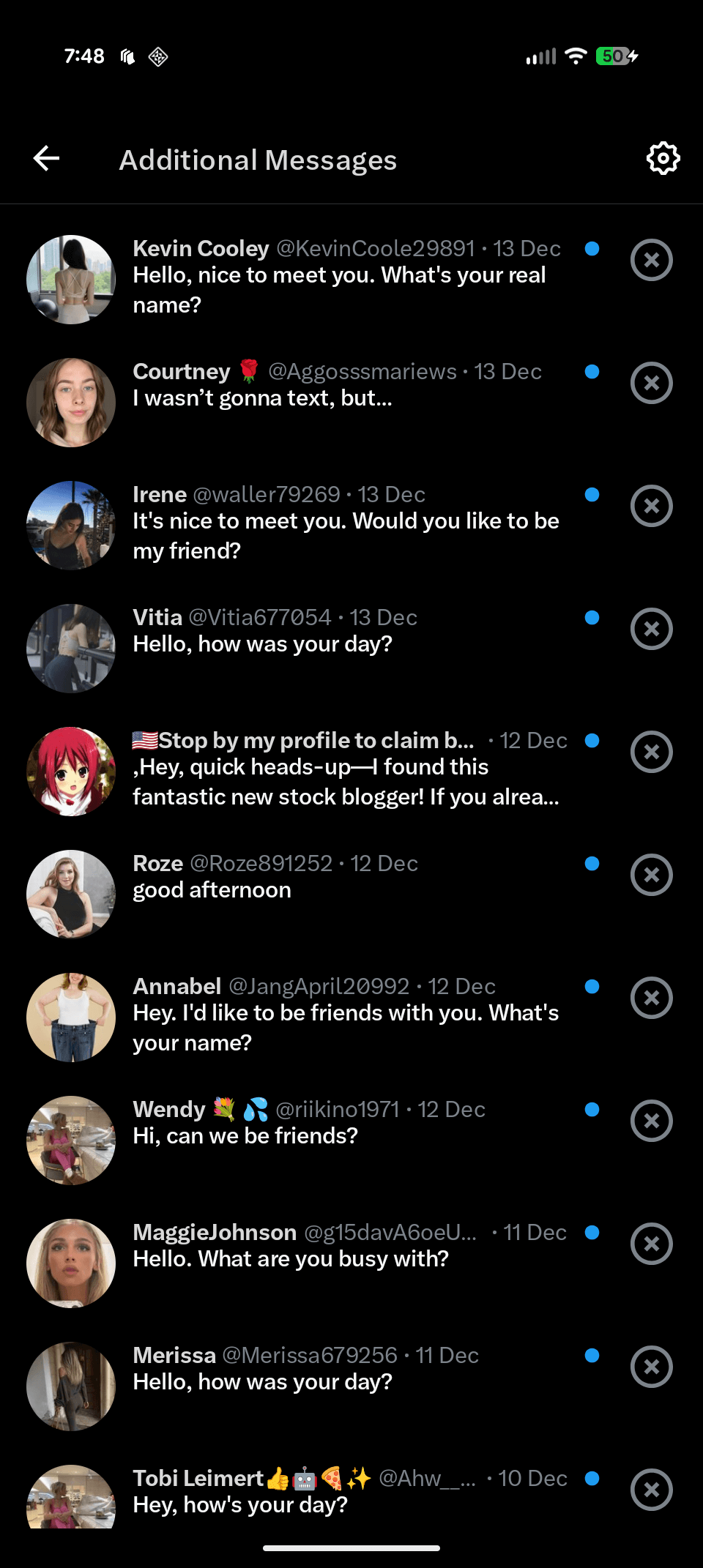 Twitter (X) direct message spam from November 17 -> December 26 (2025)