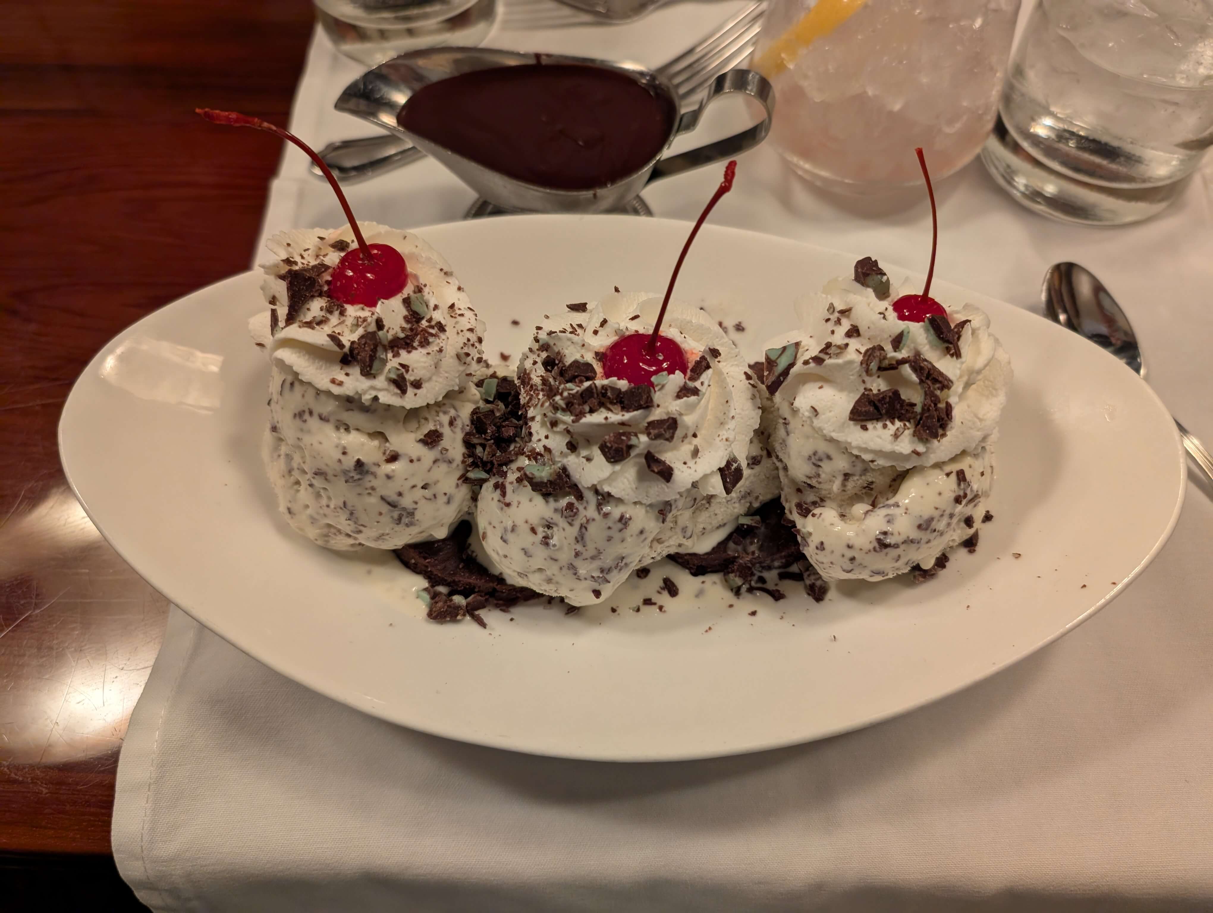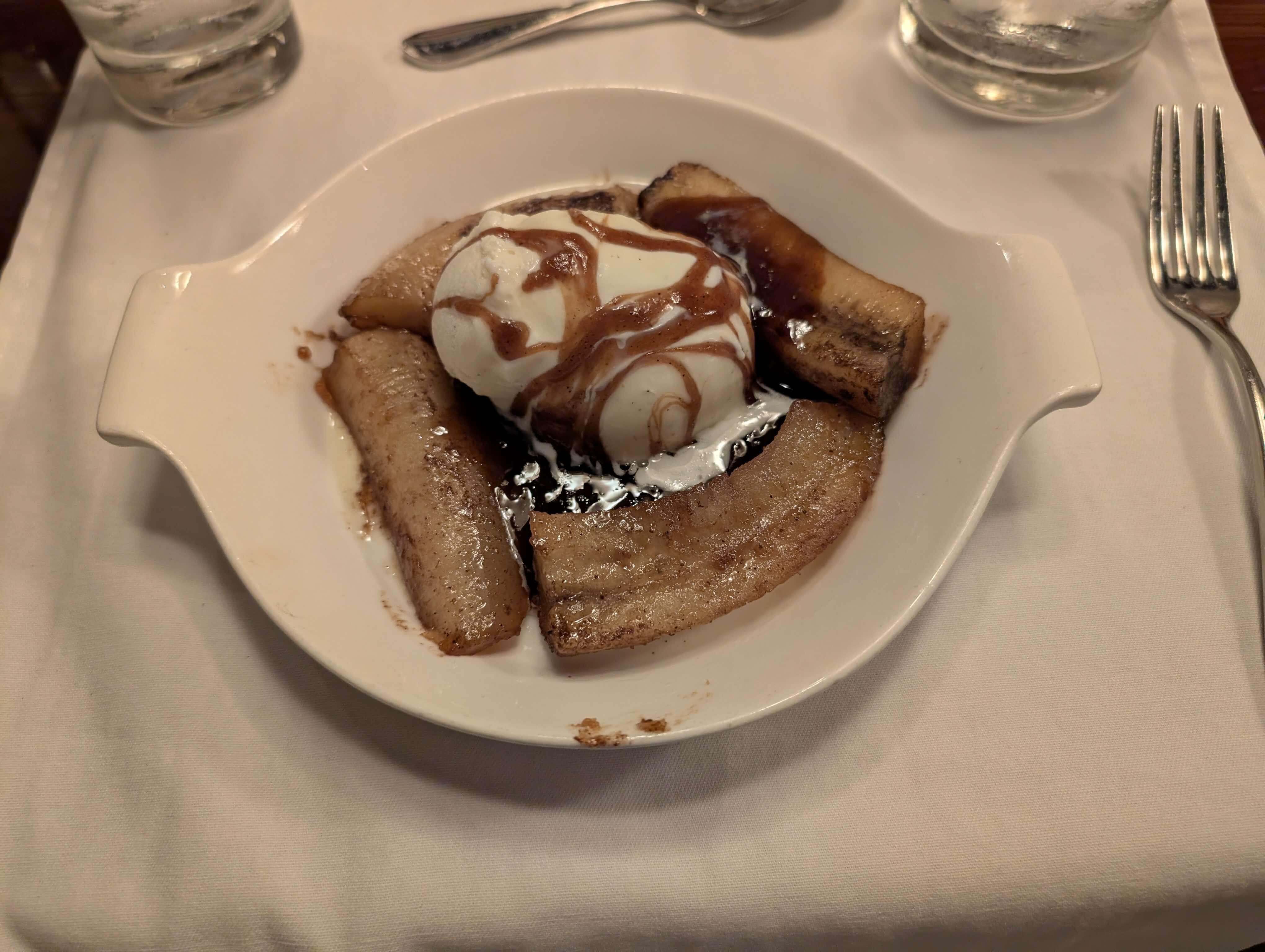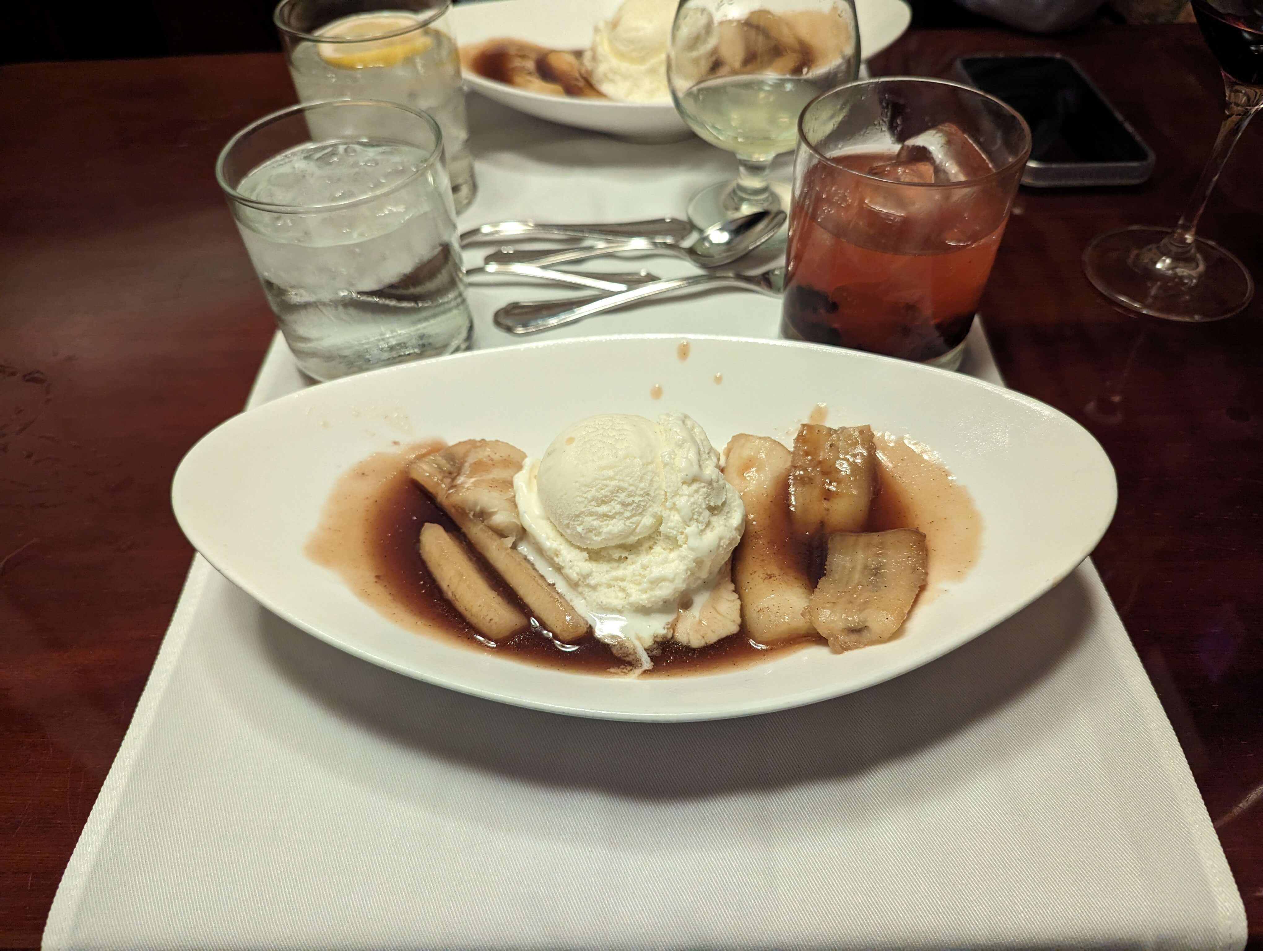I'm honing in on a simple scoop of ice cream with hot fudge, because anything else is just too much after a large steak. The ice cream quality rivals the best ice cream stores with such unique flavors on top of that. Though every time a dessert with bananas comes up in discussion I fold and order that.