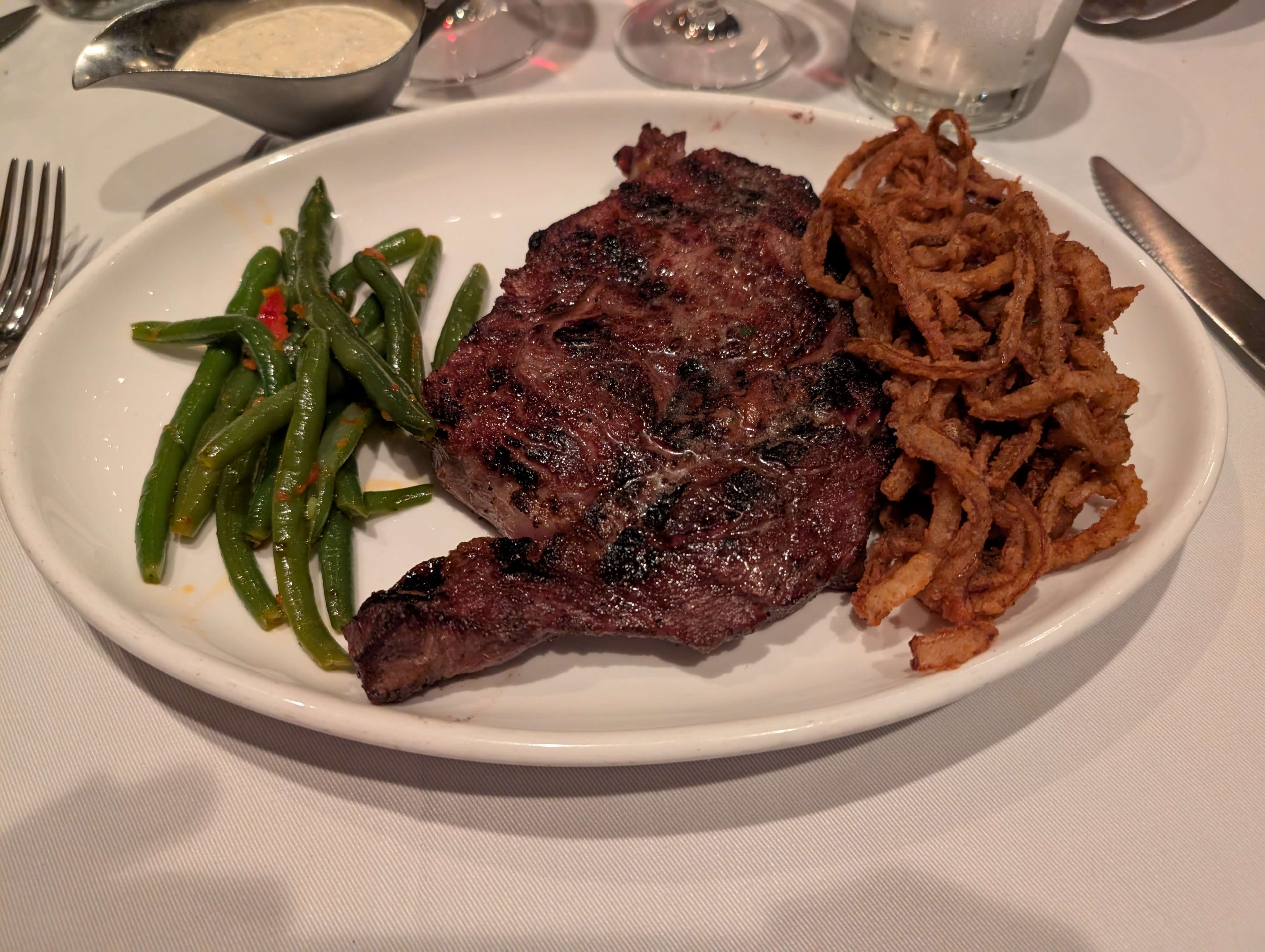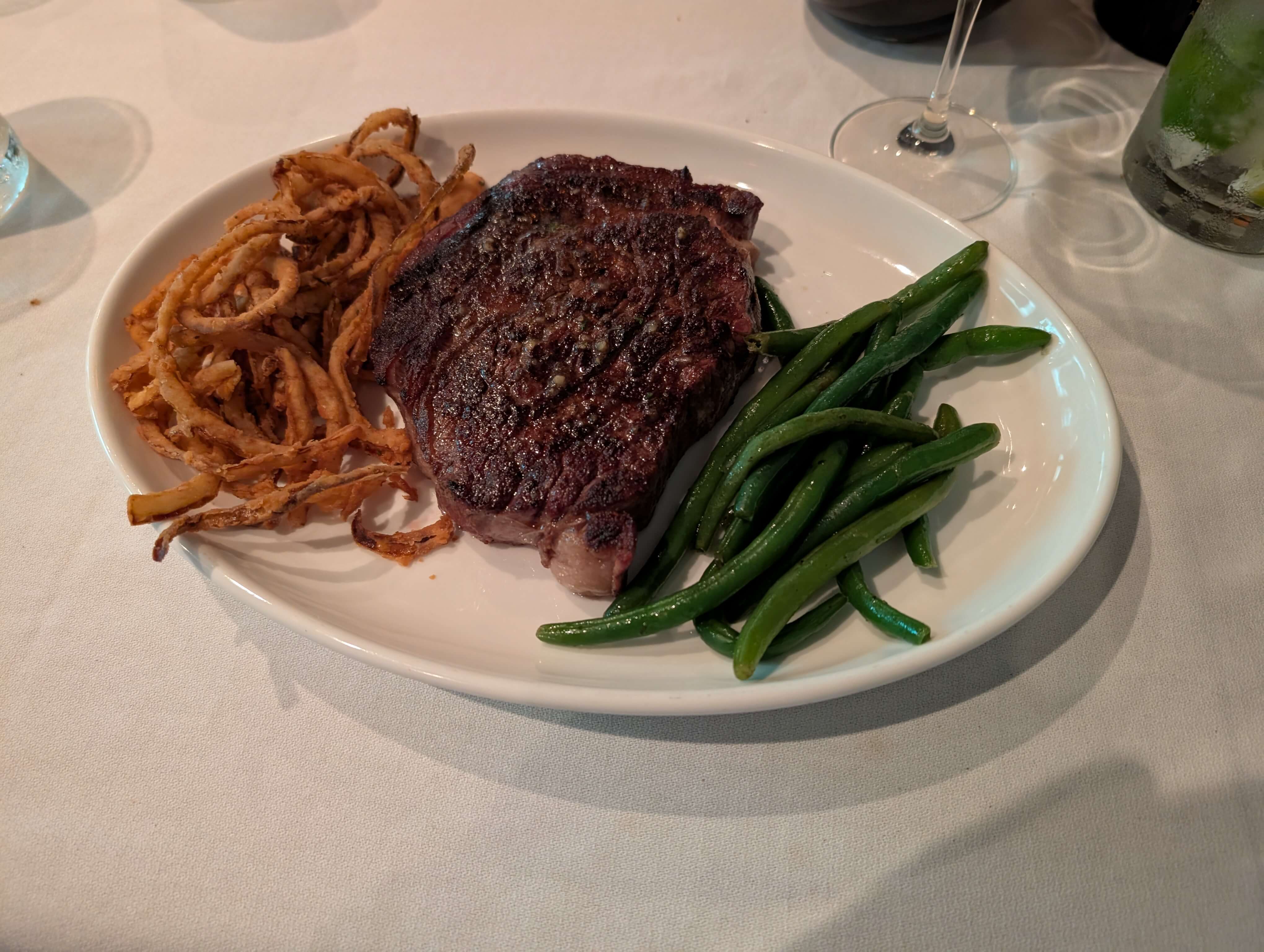 Once the steak arrives you always get a side of spiraled onion rings and the vegetable of the day, which has been green beans every single time I've been there. If there is another vegetable that makes an appearance - I haven't seen it.