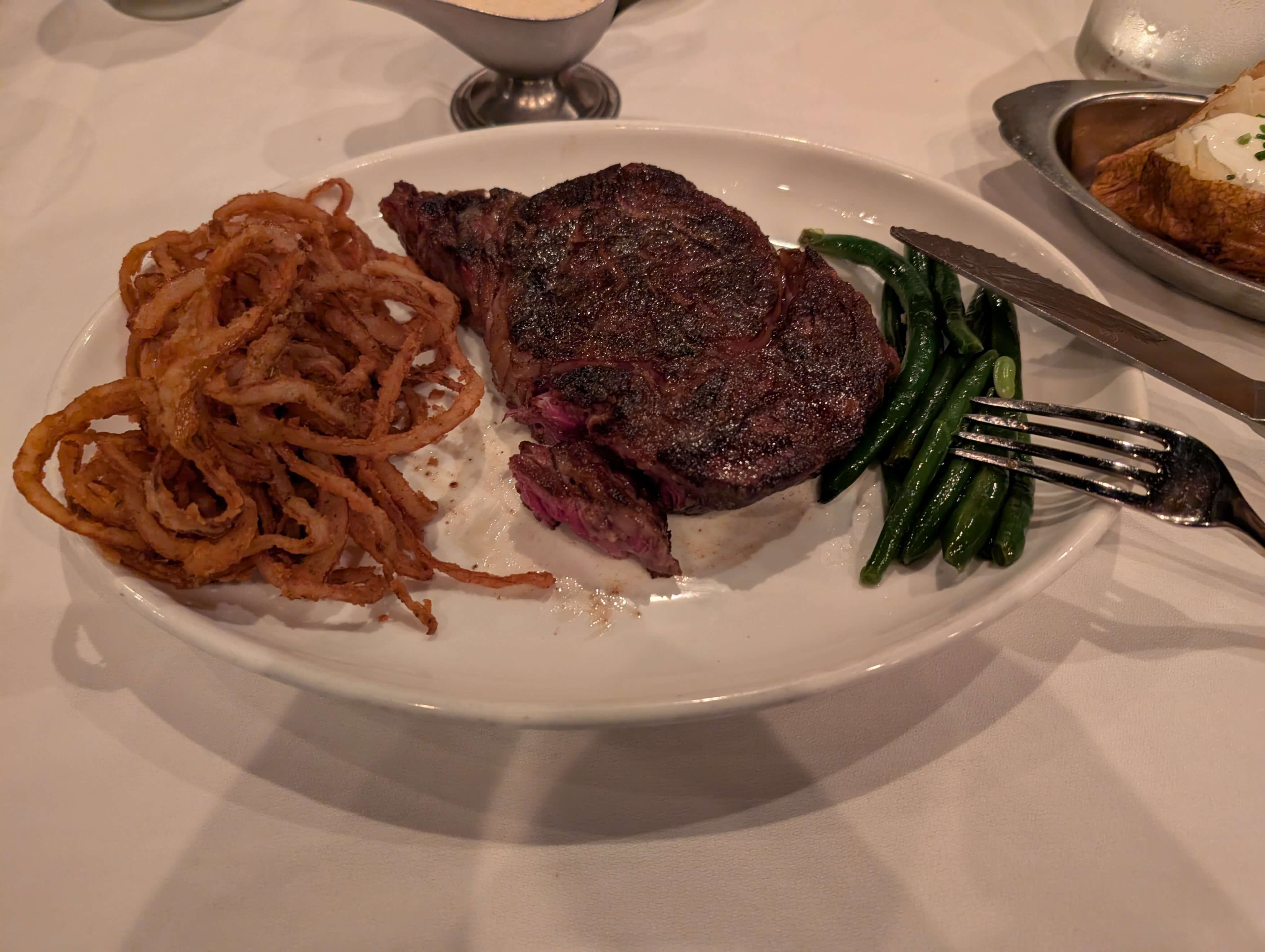 I forget eating the steak that I have onions, veggies and an entire baked potato awaiting me. In most cases I prioritize just eating all the steak because that's the experience and food I came for. By the time 12-16oz of steak has been eaten there is not much room left in my stomach for anything else.