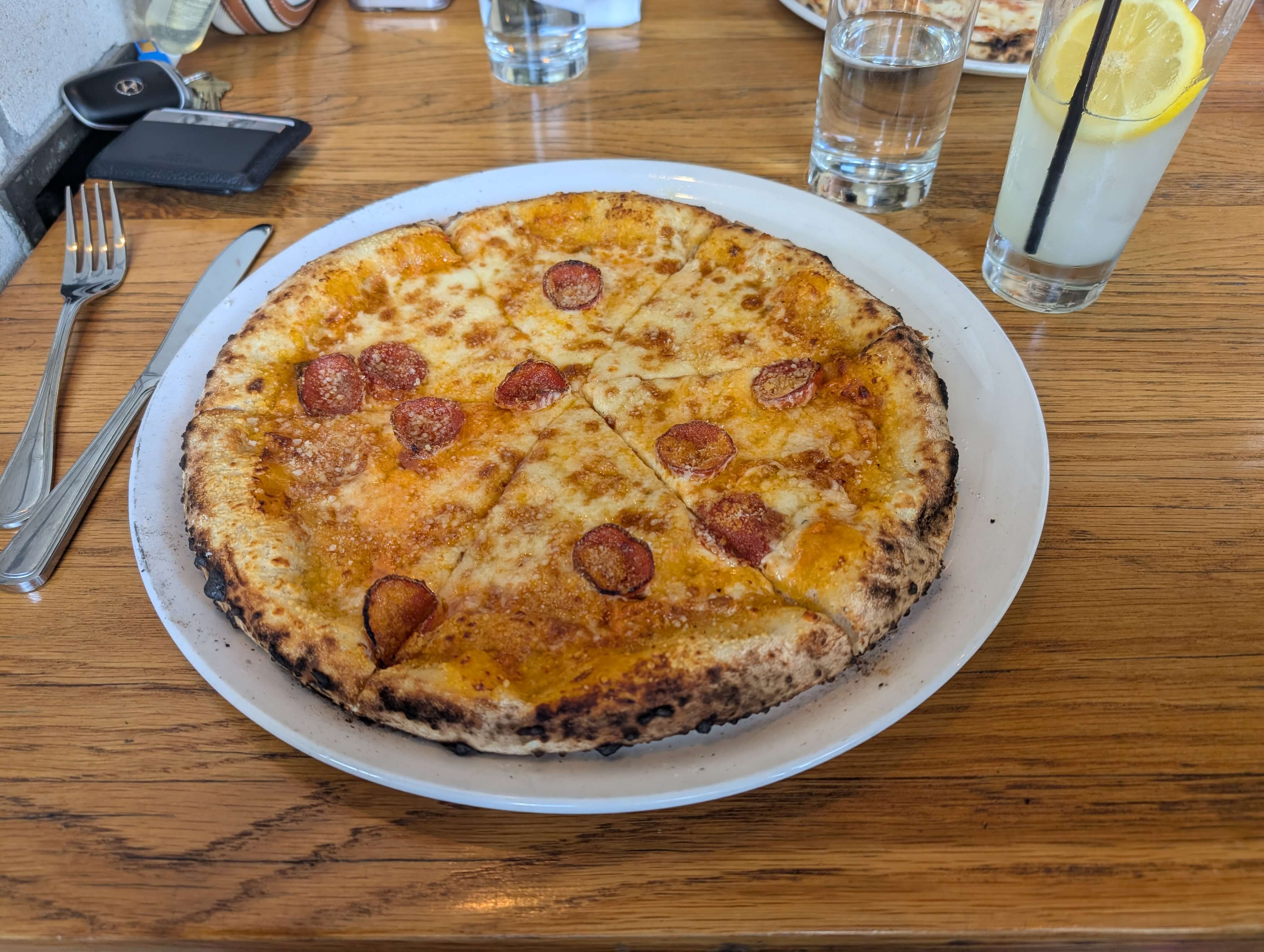 So as I enjoyed a Hot Honey Pizza I still couldn't believe how much activity there was in this restaurant all from these different frat tables. Huge groups of people leaving to walk to another table, go to the bathroom, disappear outside or any combination of that. It was around noon on a Saturday and I couldn't believe how loud and disrespectful this group of frat guys could be. Knowing I saw them hours earlier getting seated they had presumably been drinking for 3 hours.