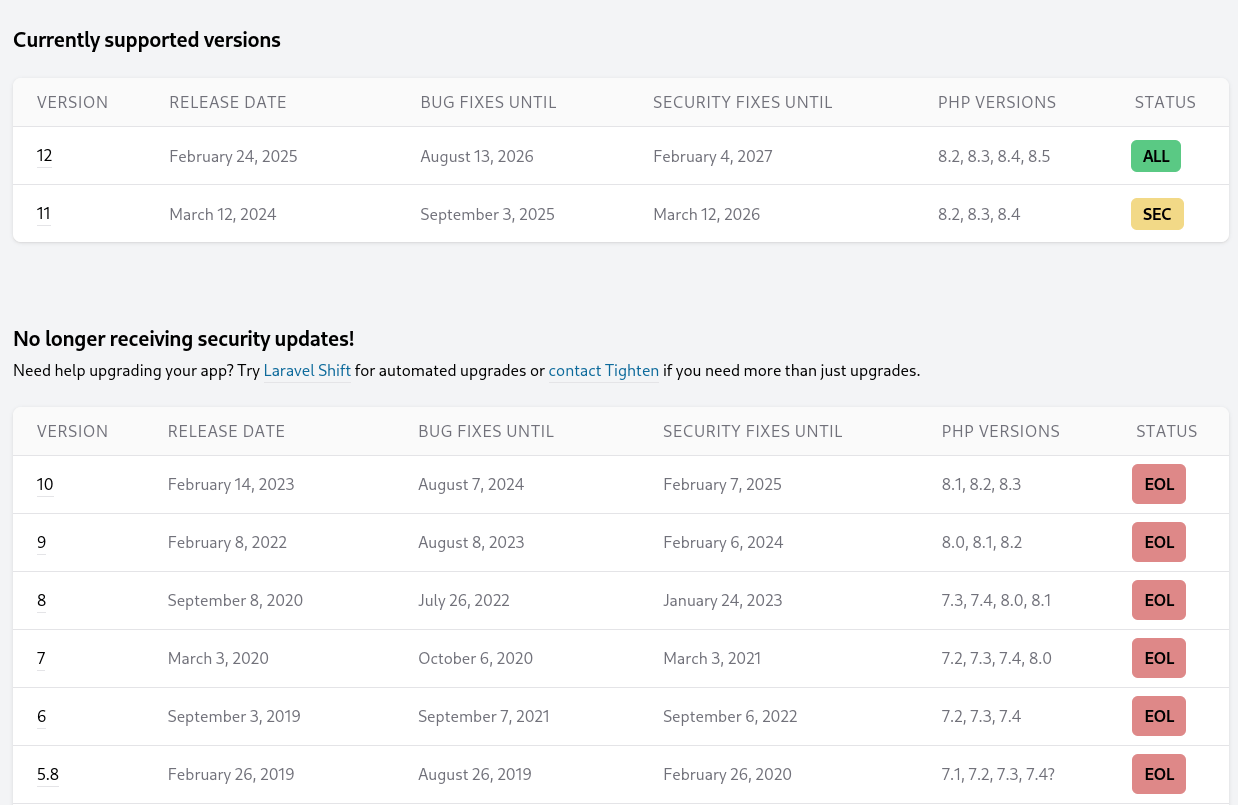 Even more so when a new PHP version came out - Laravel had it supported before its release date which was no easy task when it depended on a bunch of dependencies. I blogged about that before, but it was such a breath of fresh air to have a framework dragging the industry with it as they dropped older PHP versions on nearly every major release. The benefit also being that every dependency they depended on also got that treatment or an alternative was produced.