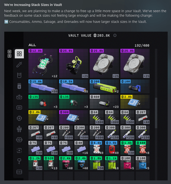 Very quickly inventory management became a chore as you could win a few games and be out of space, unable to acquire rewards and be forced to delete weaker stuff. On the flip side you'd die a few games in a row you have no gear remaining. This is where I believe Bungie learned from their previous games how to build a live service game more efficiently. Within a week of community complaints v1.0.5 came out allowing larger stack sizes in the vault. It was great to see quick changes even if some of those patches broke a few things along the way (i.e sounds). Bungie seemed to have greater control of server side changes allowing quick changes to any exploits - including perks on gear.